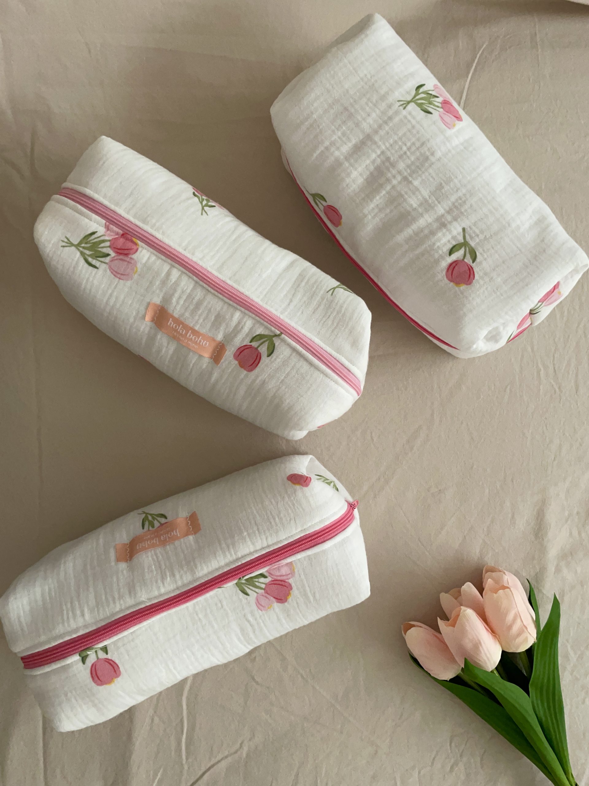 Beauty Bag Long color blanco de tejido suavecito con dibujos de tulipanes, interior de cuadro vichy rosa.