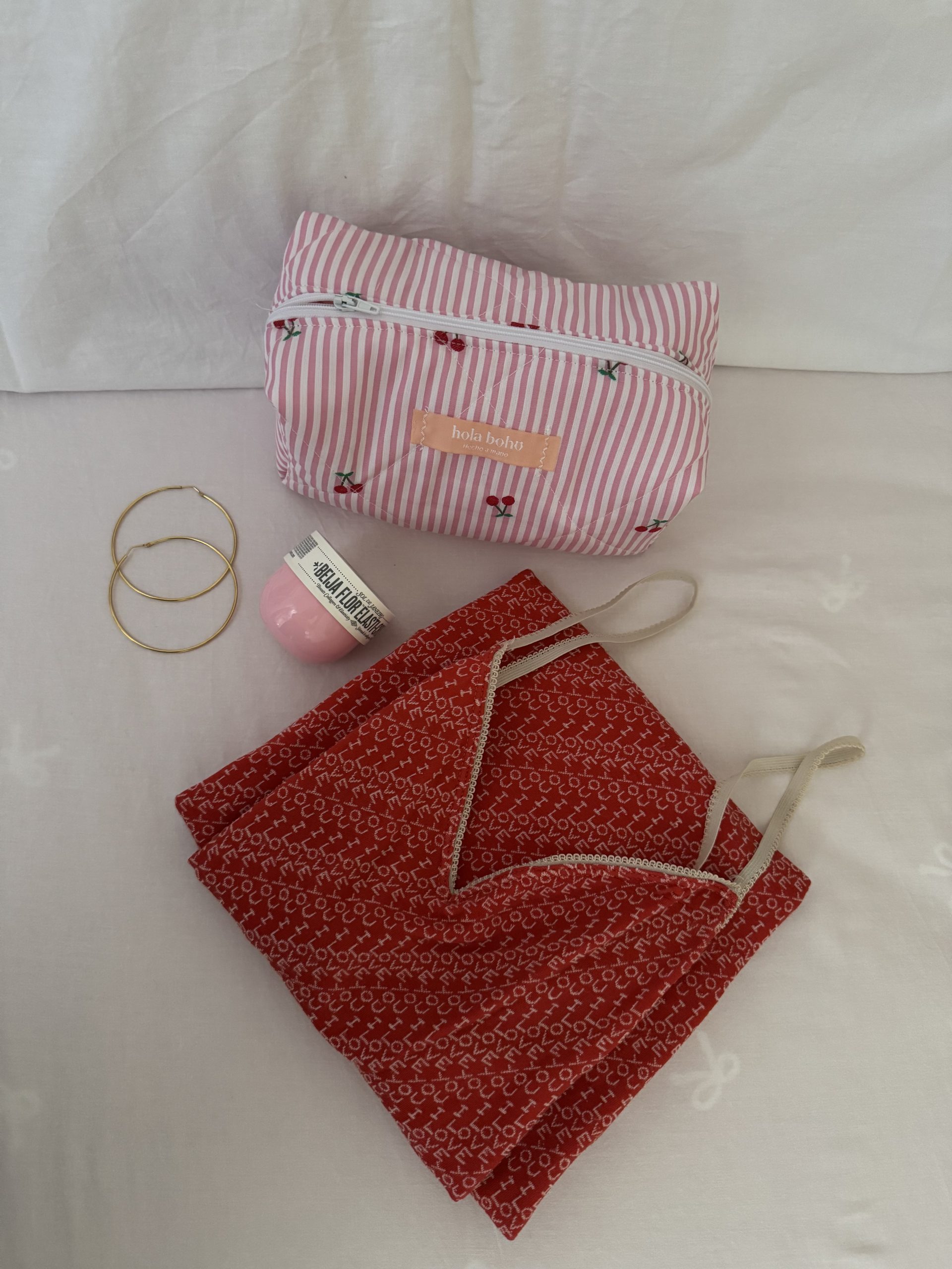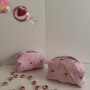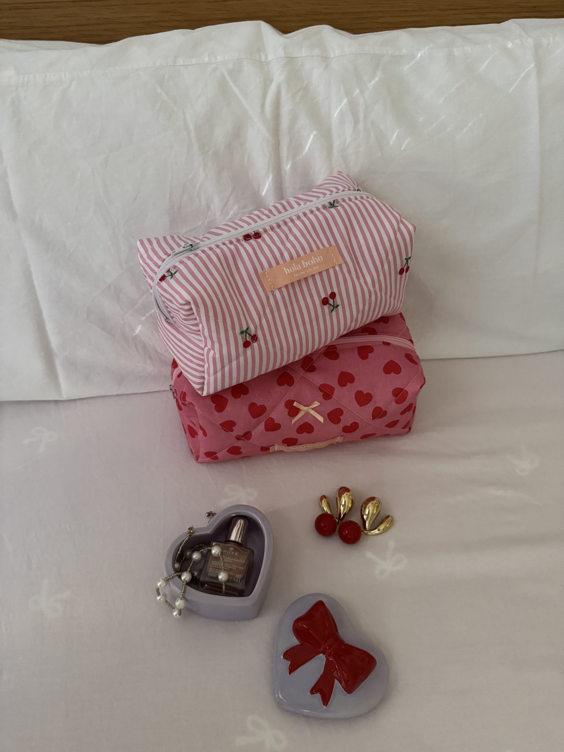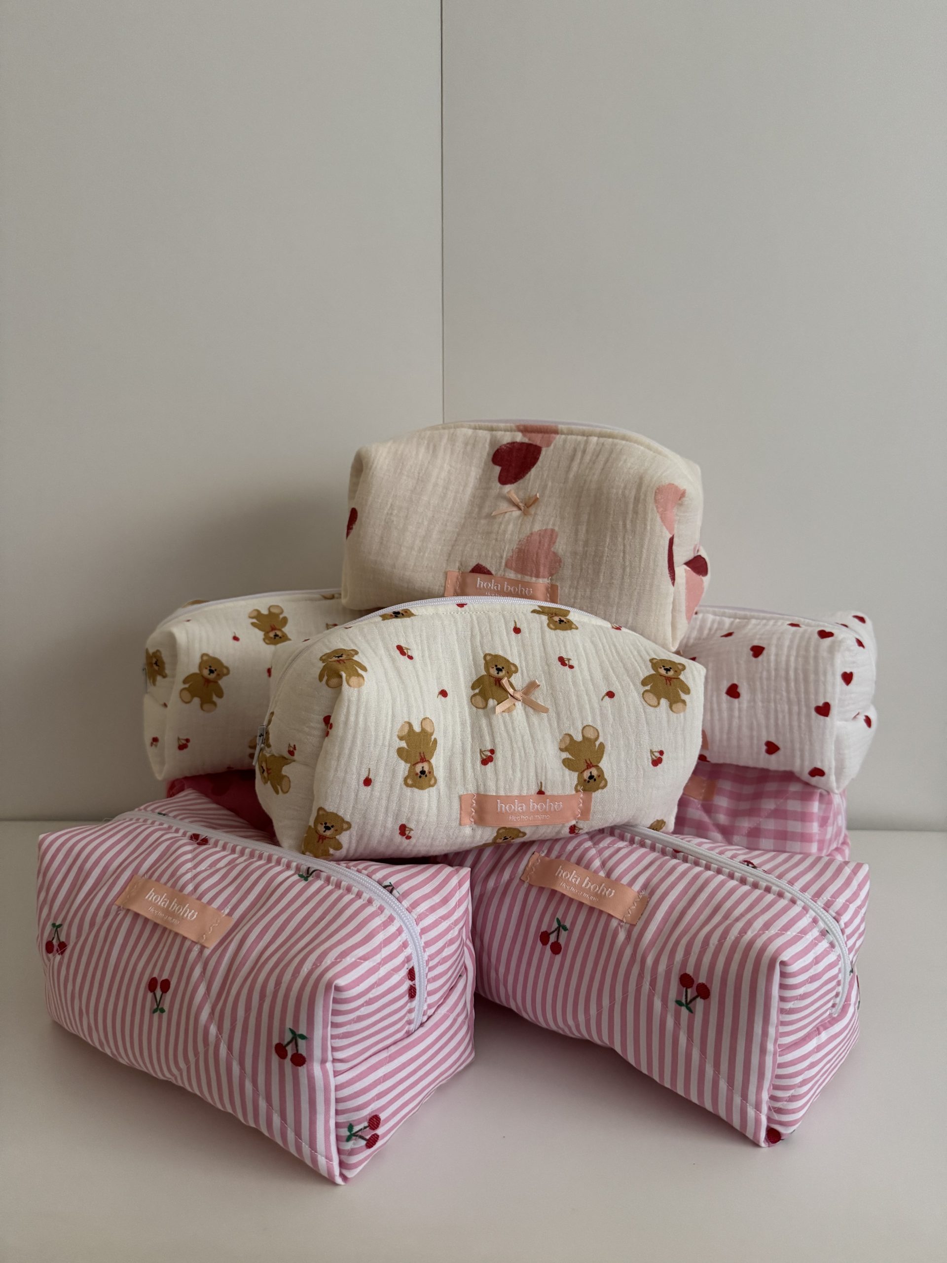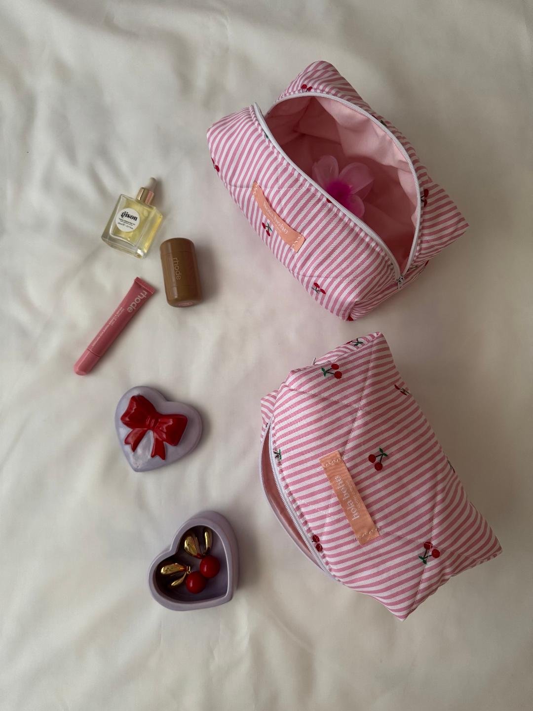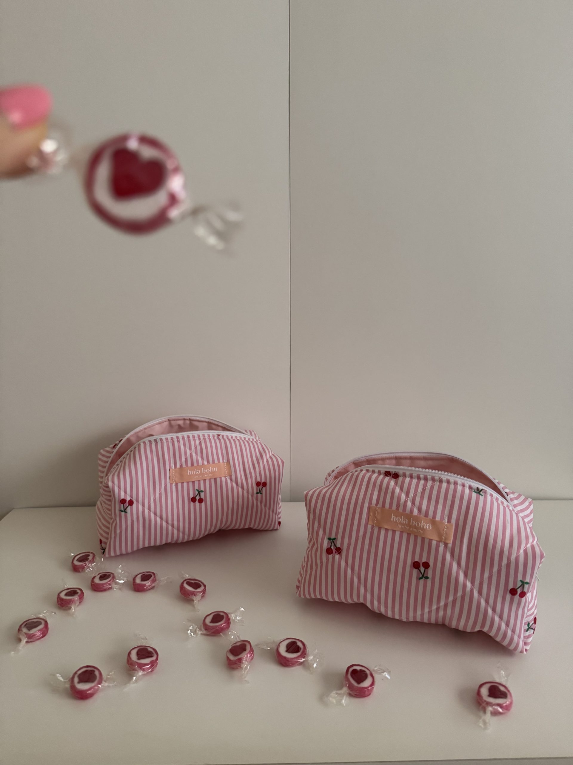 Beauty Bag de rayas color rosa con dibujitos de cerezas, interior color rosa