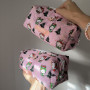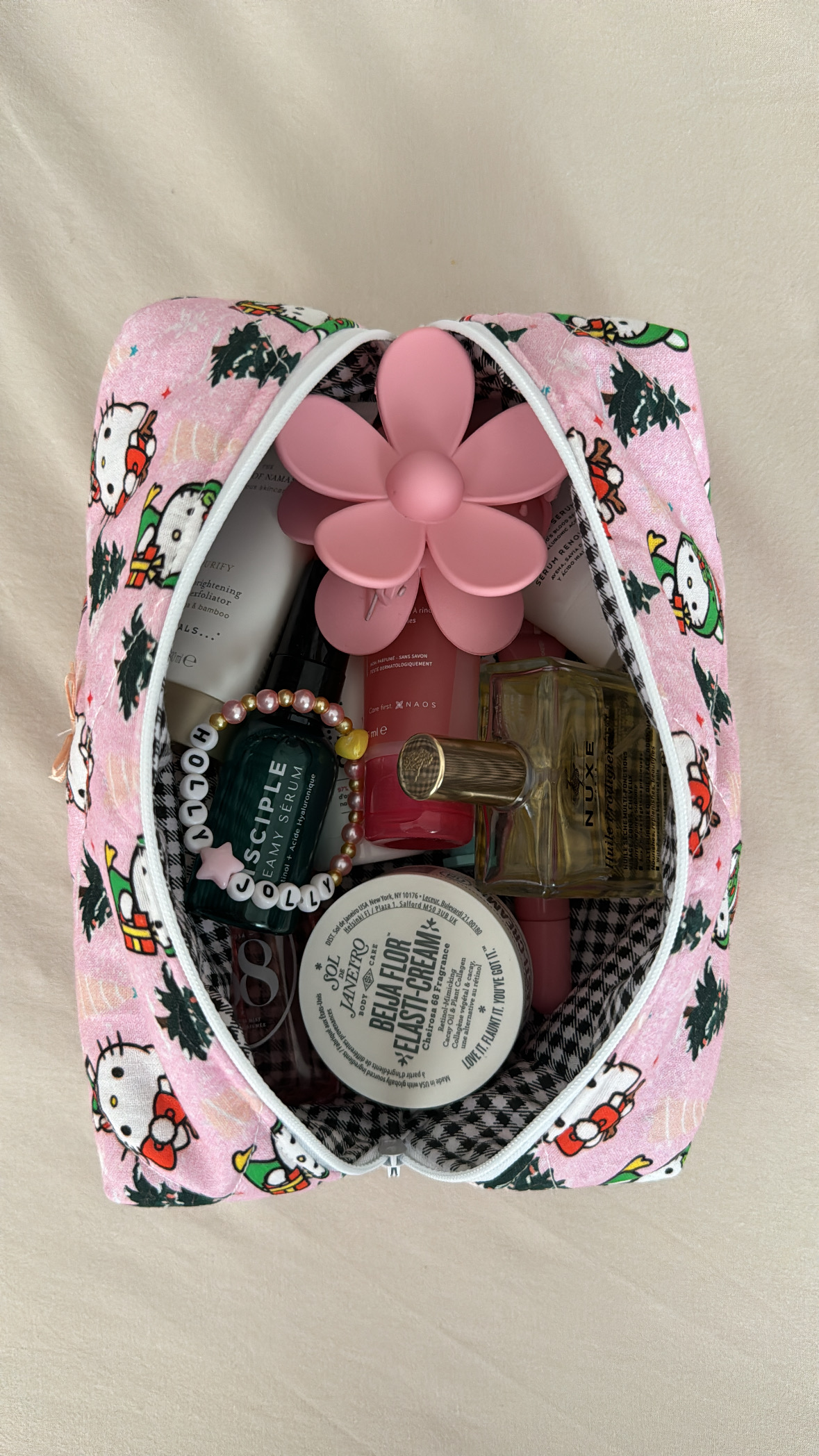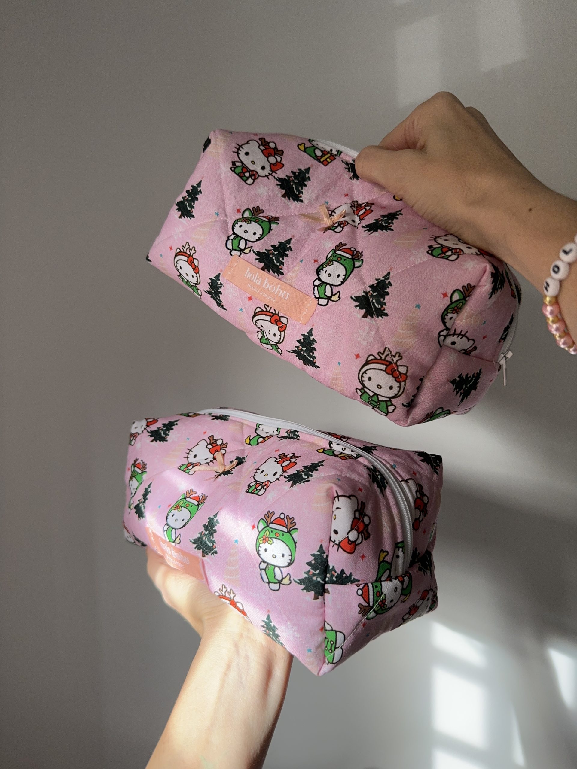 Beauty Bag color rosa con dibujitos de Hello Kitty version navideno, interior de cuadro vichy negro.