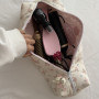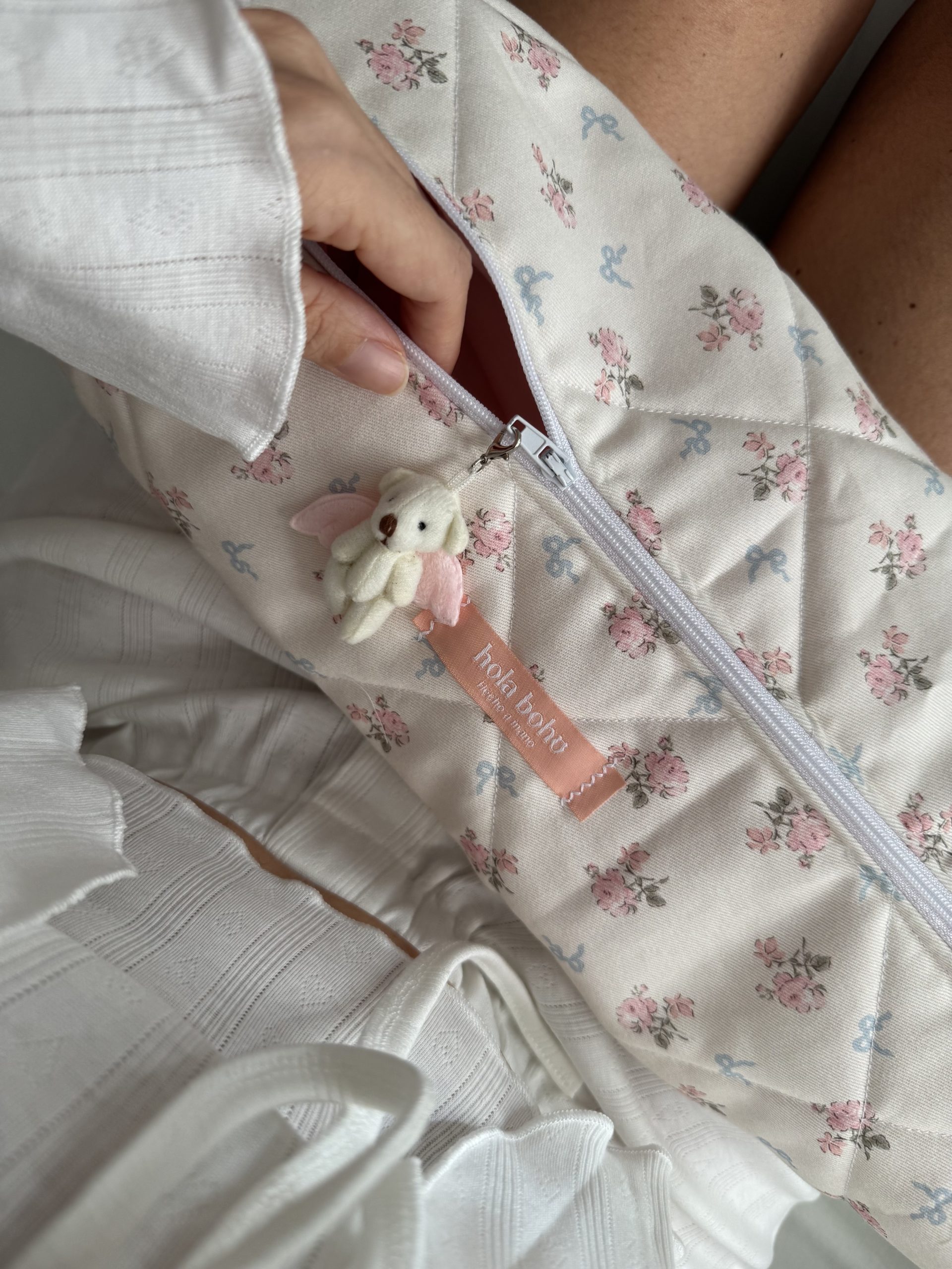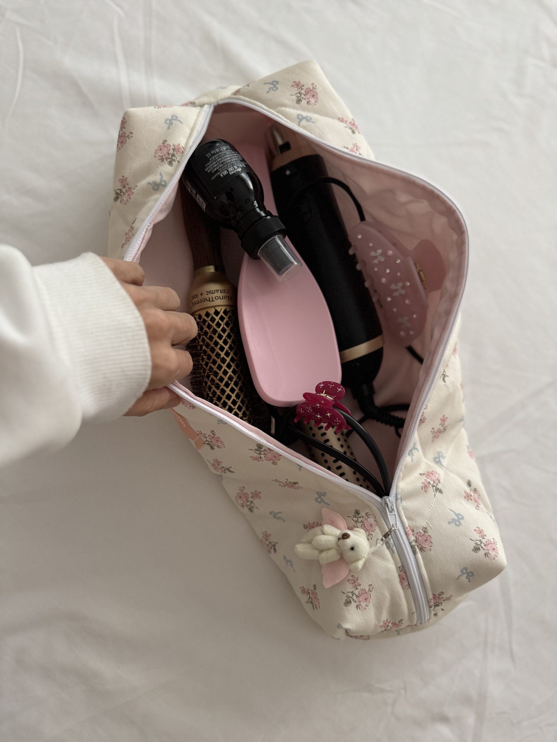 Hair tool bag color crema con dibujitos de flores y interior color rosa.