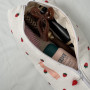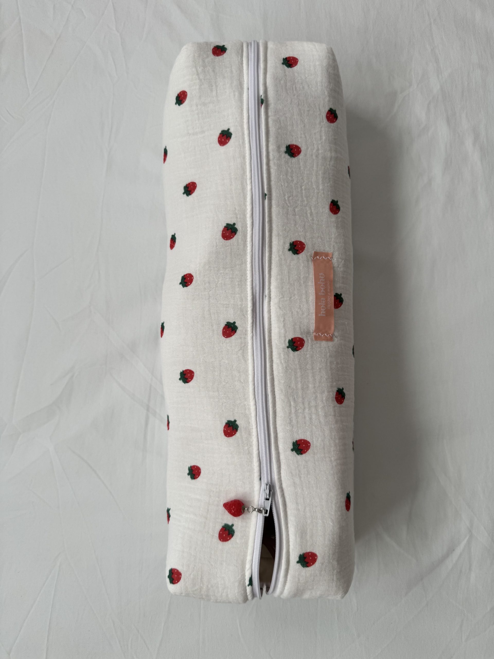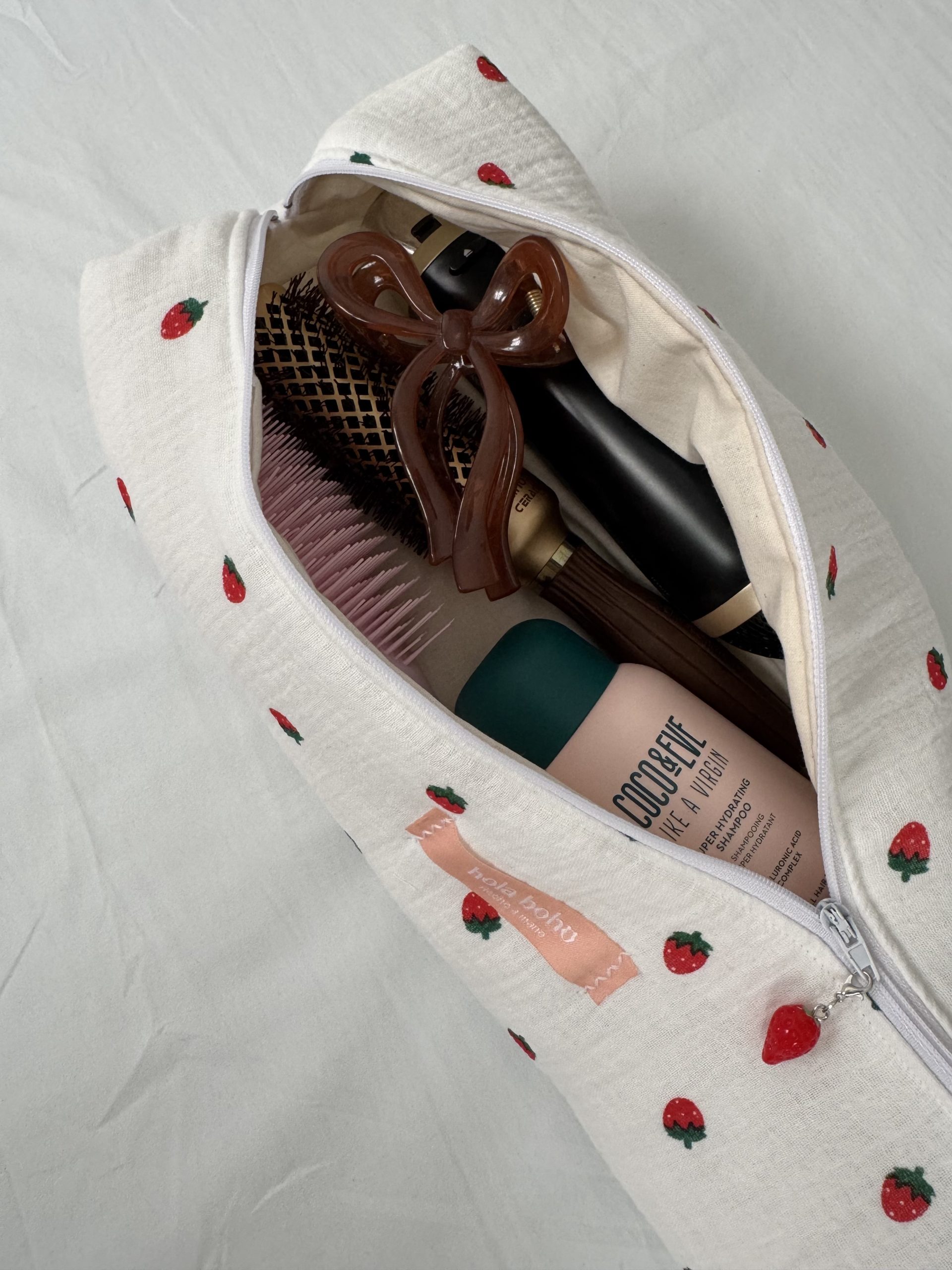 Hair tool bag color blanco con dibujitos de fresas y interior color beige.