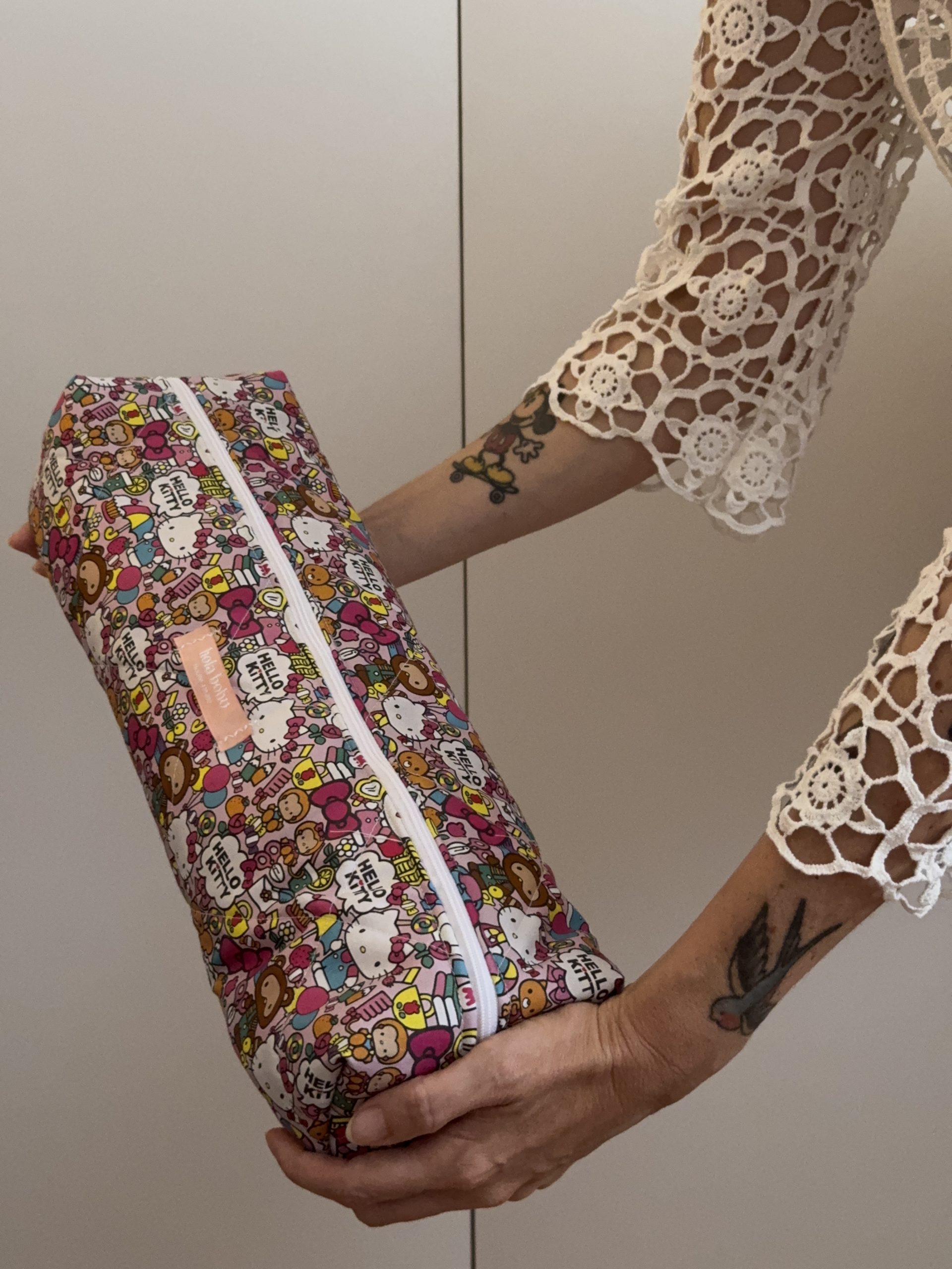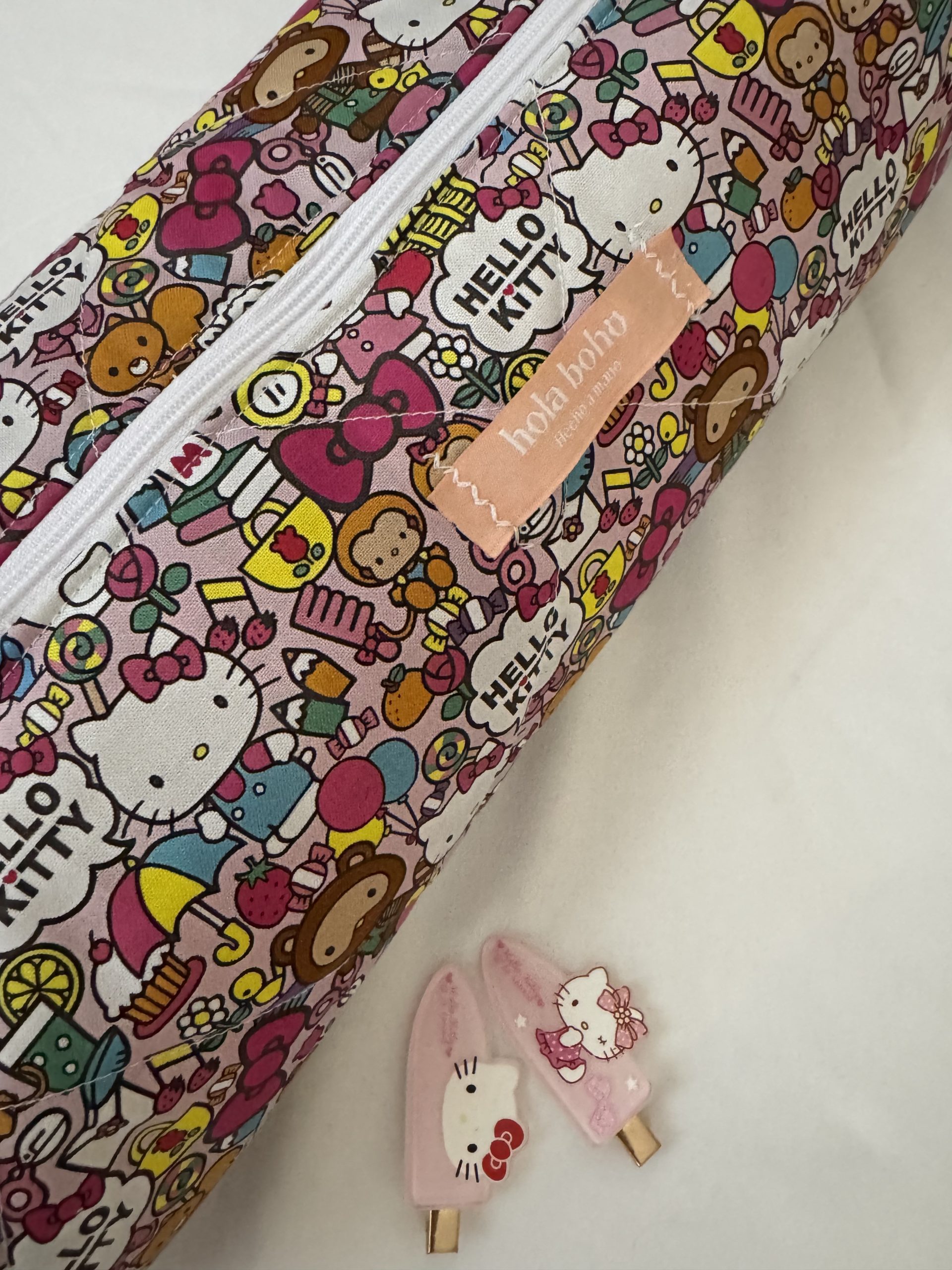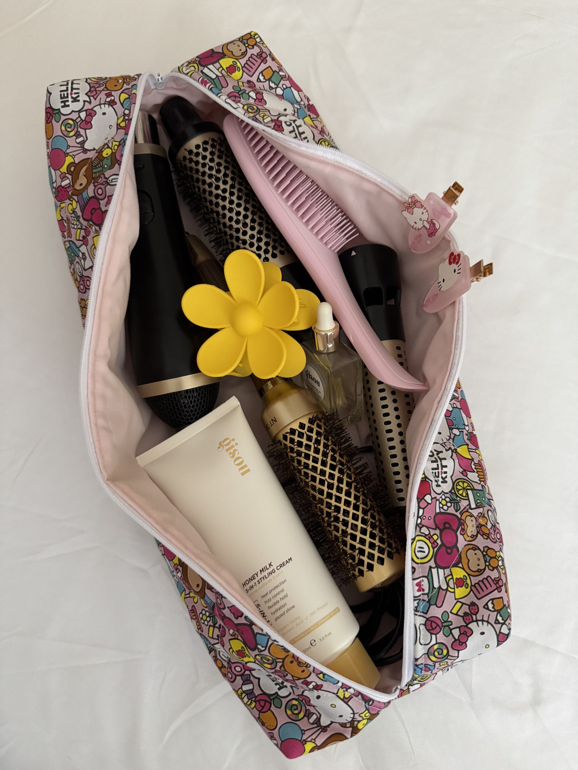 Hair tool bag color rosa con dibujitos de hello kitty, y interior color rosa.